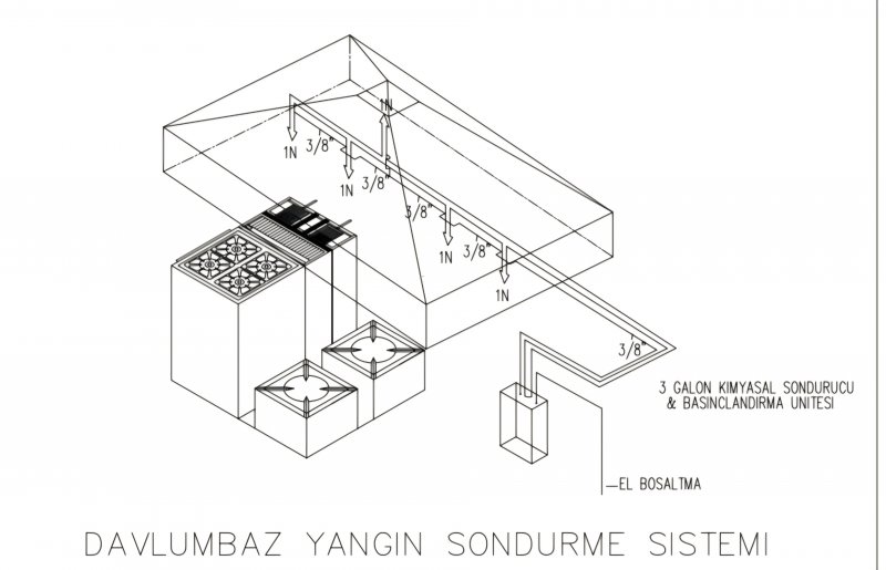Bu sıstem ticari mutfak alanında bulunan davlumbaz içi ve altında yer alan pişirme ekipmanlarının otomatik olarak söndürülmesini ve korunmasını kapsamaktadır.
